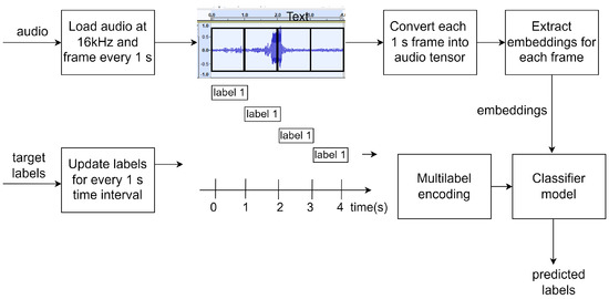 Overview of data processing for classifier. The input audio signal must be filtered and resampled to a sampling frequency of 16 kHz since BEATs accepts audio sampled at this frequency. A window of 1 s duration is applied on the input audio to obtain frames of length 1 s. These frames are converted to tensor format and fed into the BEATs model to generate embeddings for each frame. The annotations must also be updated for every 1 s duration. In the multi-label encoding stage, they are converted to a binary matrix that contains the presence (1) or absence (0) of each class/label for each 1 s frame. The classifier is trained to classify the embeddings corresponding to one second of input audio from these reference labels in a supervised learning format.