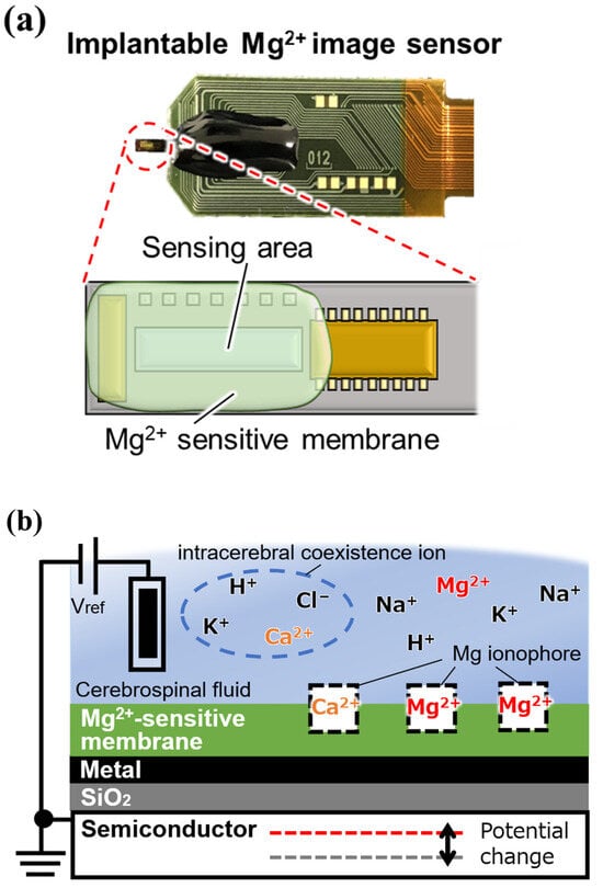 Our group has developed a 23.55 µm pitch implantable potentiometric biosensor that enables label-free real-time imaging of hydrogen ions (H+) distribution [18]. Using this sensor, we previously demonstrated the imaging of changes in extracellular proton dynamics in a living mouse brain [19]. Furthermore, the sensor’s pixel pitch was achieved at 5.65 × 4.39 µm2 in recent years, showing a potential for high spatiotemporal H+ imaging [20]. Furthermore, we succeeded in measuring calcium ions (Ca2+) by immobilizing ionophores on a sensor that selectively detected specific ions [21]. However, the measurement of Mg2+, which has been pointed out to be closely related to memory, has not been demonstrated.