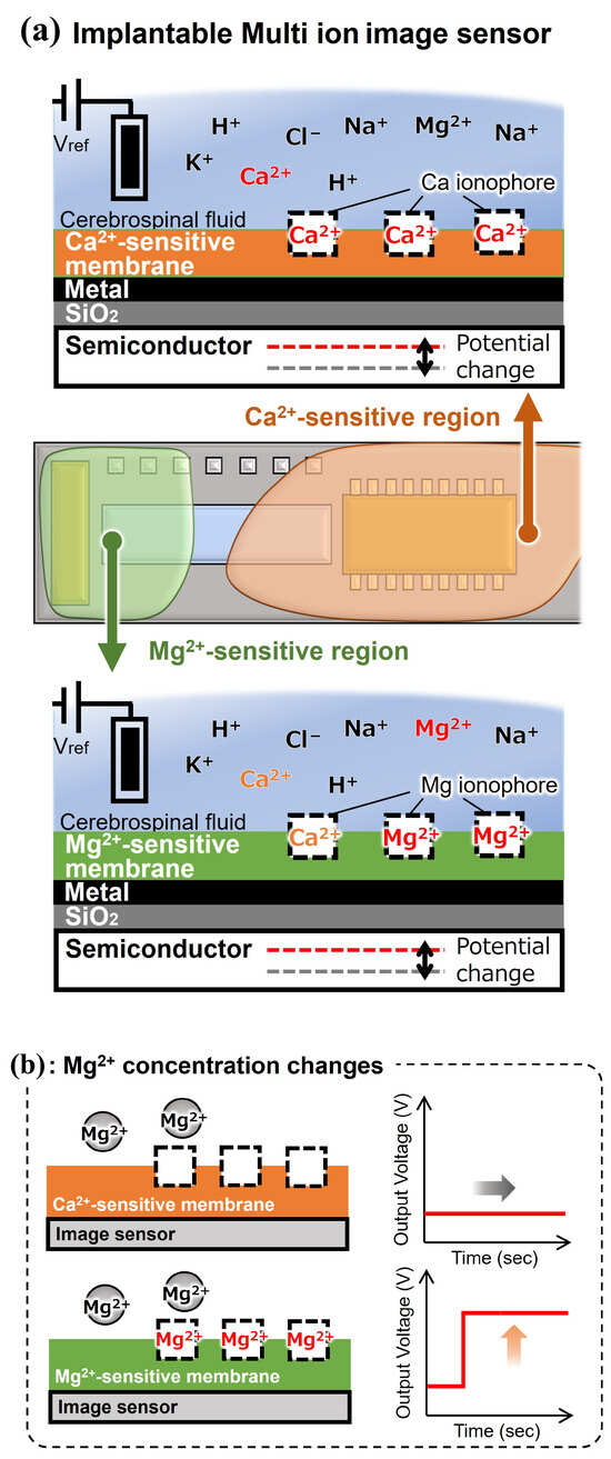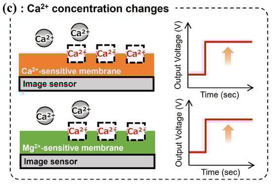 Overview and measurement concept of an implantable multi-ion image sensor: (a) outline, (b) sensor response to change in the Mg2+ concentration, and (c) sensor response to change in the calcium ion (Ca2+) concentration.