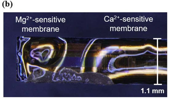 The resulting mixtures were applied to an implantable ion image sensor to form sensitive areas, as shown in Figure 4a. After formation, the films were dried at room temperature (25 °C) for 12 h. A micrograph of the sensor chip surface after the PVC membrane formation is shown in Figure 4b. The Mg2+- and Ca2+-sensitive membranes were separately deposited on the pixel area.