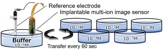 To confirm the concentration dependence of the Mg2+- and Ca2+-sensitive regions in the fabricated implantable multi-ion image sensor, measurement solutions were prepared by varying the concentration of each ion in a buffer solution that mimicked the brain. The tip of the fabricated sensor was immersed in a buffer solution for at least 6 h to obtain a sensitive membrane. As shown in Figure 5, the ion response characteristics to changes in the concentrations of sodium ions (Na+), K+, and H+, in addition to Mg2+ and Ca2+, which are the measurement targets, were measured by changing the sensor every 60 s in a Petri dish filled with a concentration measurement solution. The composition of the base buffer solution is potassium chloride (KCl): 2.5 mM, sodium chloride (NaCl): 150 mM, calcium chloride (CaCl2): 2 mM, magnesium chloride (MgCl2): 1 mM, glucose: 10 mM, and hydroxyethylpiperazine ethane sulfonic acid (HEPES): 10 mM, and the pH is about 7 pH. The concentration of the ions to be measured varies from 10−6 to 10−1 M in 1-digit increments, and the pH varies from 7 to 8 pH in 0.5 pH increments.