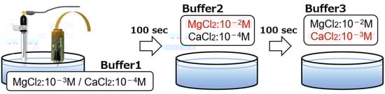 To verify the performance of the implantable multi-ion image sensor in the detection of Mg2+ concentration changes and for quantitative measurements, the potential response was measured by varying the concentrations of Ca2+ and Mg2+ in the buffer solution. The three buffers used were the same as those used in Section 2.3 for the base. Buffer 1 contained MgCl2 at 10−3 M and CaCl2 at 10−4 M, buffer 2 contained MgCl2 at 10−2 M and CaCl2 at 10−4 M, and buffer 3 contained MgCl2 at 10−2 M and CaCl2 at 10−3 M. At the start of the measurement, the sensor was inserted into buffer solution 1. After 100 s, the sensor was transferred to buffer solution 2 and, after another 100 s, to buffer solution 3 (Figure 6). Therefore, it is possible to evaluate the response of this sensor to the Mg2+ concentration change in the transition from buffer solution 1 to buffer solution 2 and to the Ca2+ concentration change in the transition from buffer solution 2 to buffer solution 3.