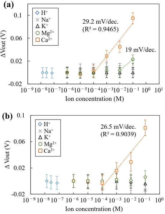 Concentration dependence for the chemicals: (a) the sensor response for the Mg2+ sensitivity region, and (b) the sensor response for the Ca2+ sensitivity region. The error bar means the standard deviation of the VOut signal obtained from each sensitive region.