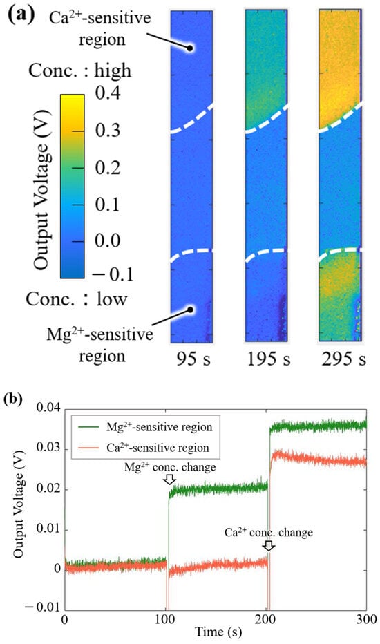 To demonstrate the simultaneous imaging of Mg2+ and Ca2+ responses and the quantitative measurement of the concentration change, visualization experiments were performed using Mg2+ and Ca2+ solutions. Figure 8a shows the imaging results for the Mg2+ and Ca2+ responses. The ΔVOut of the sensor is shown as an absolute value with a 0.5 V scale by a color bar: the yellow color indicates a high concentration of Mg2+ and Ca2+, and the blue color indicates a low concentration. The output image of the Mg2+-sensitive region changed with the Mg2+ concentration. Additionally, the images of both sensitive regions were observed soon after the addition of the Ca2+ solution.