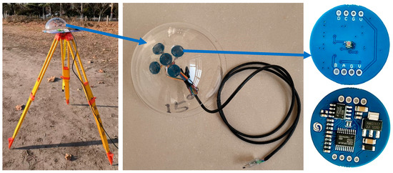 Based on the above-mentioned principle, we developed a multi-angle light intensity sensor that can measure direct solar radiation and scattering radiation directly. The appearance is shown in Figure 1, i.e., five completely identical light intensity sensors are separately installed on the top, as well as the front, left, back, and right with a tilting angle of 15° of a transparent hemisphere (note: actually, exposing the photosensitive point will be better because it can avoid the reflection of the hemisphere surface; and the hemisphere is just for the convenience of controlling the tilting angle and the protection of the sensors), and these sensors are used to measure the light intensity facing different directions in real time so as to achieve the separation of direct and scattering radiation. For the solar spectrum in the visible to near-infrared range, the proportion of direct solar radiation at different wavelengths is roughly equal. So, the sensors sensitive to the visible and near-infrared spectral range can be selected for light intensity measurement. In this study, five GY-485-44009 light intensity sensors with a measurement range of 0–188,000 lux are used, and typically, the illuminance near the land surface cannot exceed the maximum. A USB-to-RS485 converter is used with a 5V DC power supply and data transmission (Baud rate: 9600 bps or 115,200 bps), and data collection is achieved by sending commands to each device address in sequence.