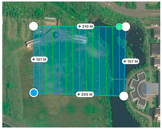 Additionally, an integrated solar irradiance sensor is mounted on the top of the aircraft. The sensor can capture synchronous solar irradiance information for each multispectral image, and the information is recorded in the XMP metadata of each image. Please refer to the document “https://dl.djicdn.com/downloads/p4-multispectral/20200717/P4_Multispectral_Image_Processing_Guide_EN.pdf (accessed on 20 December 2024)” provided by DJI for more detailed descriptions. The flight height is set to 45 m, and the image resolution is about 2.3 cm. The heading overlap rate is 80%, and the side overlap rate is 60%. There are 13 flight routes (as shown in Figure 2) that cover an area of about 200 m × 150 m (118°16′44.8″ E–118°16′53.5″ E, 35°06′52.9″ N–35°06′58.4″ N). If scattering radiation is dominated (e.g., on an overcast day), the light intensity sensor is less affected by the altitude changes of the aircraft. On the contrary, if direct radiation is dominated (e.g., on a very clear day), the scattering part can be almost ignored, and usually satisfactory results can also be obtained by using the cosine function correction to directly measure light intensity values. Moreover, if the flight direction is perpendicular to the sun’s direction, it can alleviate the impact of sensor tilt. In all cases, the worst scenario is that the light intensity fluctuates due to cloud cover, and the flight direction is consistent with the sun’s direction. In this case, the light intensity sensor is most sensitive to altitude changes, and the cosine function correction is also ineffective in achieving good results. To verify the effectiveness of the proposed method in this study, the test was implemented in the most challenging scenario, i.e., it was carried out on a cloudy day, and the flight direction was intentionally set to be approximately consistent with the sun’s direction. The total duration of the photogrammetry process is approximately 12 min (10:30:34–10:42:32). There are 338 captures involving the five multispectral bands. Note: The flight route planning application we used allows the imaging system to be in a shooting state even at turns, which leads to rapid altitude changes that result in inaccuracies of the drone-carried light intensity sensor. Hence, images captured at both ends of each flight route need to be discarded (30 captures are involved).