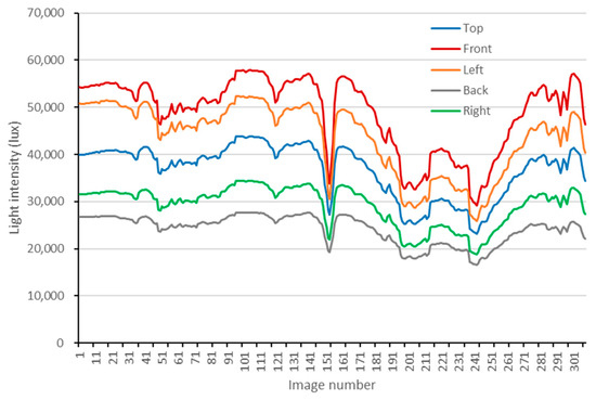 Light intensity measured by the self-developed multi-angle light intensity device in different directions corresponding to each image capture time (20 December 2024).