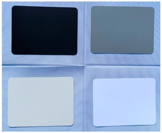 First, radiation component separation is carried out synchronously with the aerial photogrammetry using the self-developed multi-angle light intensity device, and the measured results are shown in Figure 3. Further, in order to obtain the gain value and the bias value using Equation (11), four calibration boards (see Figure 4) were used in this study. The reflectance of the calibration boards was measured by using a PSR-1100 hyper-spectrometer in advance, and the results are shown in Figure 5.