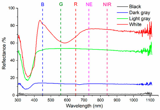 Under stable illumination conditions, after the elimination of vignette effect and lens distortions, if an image including a group of (two or more) reference boards with different reflectance is taken during the photogrammetry process, the DNs recorded in each band can be directly converted into land surface reflectance through linear stretching calculations [30,31,32]. However, the above method not only has to rely on calibration boards but also usually generates inaccurate results [33,34,35] because of the extraordinarily complicated conditions, which are particularly evident in the following aspects: (1) The illumination conditions might change with varying cloud cover and solar altitude. (2) To capture high-quality images, the camera’s exposure time, aperture size, and ISO value need to be adjusted with the illumination conditions, and this might lead to inconsistency in the recorded DNs even for the same target under the same illumination conditions. (3) In some special sites such as dense forests, water surfaces, and swamps, it is difficult or impossible to place reference boards, and moreover, it is unrealistic to capture the reference boards in each image.