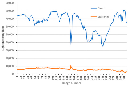 The least square method is used to solve the overdetermined equation of constructed by Equation (7). The measured results of direct and scattering radiation are presented in Figure 6. Consequently, the direct radiation proportions corresponding to the entire image capture time can be obtained, and the results are shown in Figure 7. Note: It has been tested that discarding the sensor-measured results with excessively large incident angles can enhance the accuracy and robustness of the results.