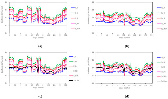 The ground-received irradiance was calculated using Equation (13). By comparing the irradiance results directly recorded by the light intensity sensor mounted on the drone (see Figure 8a) with the corrected ground-received irradiance (see Figure 8b), the correction effect of the proposed method in this study is evident. As shown in Figure 8a, drastic fluctuations occur at the end points of flight routes due to flight direction changes. Fortunately, the corrected results in Figure 8b can significantly reduce drastic fluctuations. Since the top sensor remained horizontal throughout the testing process, its measured values should linearly correspond to the irradiance received by a horizontal ground surface. To facilitate comparison, the measured values of the top sensor in Figure 3 are divided by 100,000, and the results generate a reference line. Then, the reference line is added to Figure 8a and Figure 8b, and the results are shown in Figure 8c and Figure 8d, respectively. As shown in Figure 8d, the profiles of the corrected irradiance curves closely match the shape of the reference line, differing only by a certain scaling factor. Therefore, the results above validate the effectiveness of the proposed method in this study.