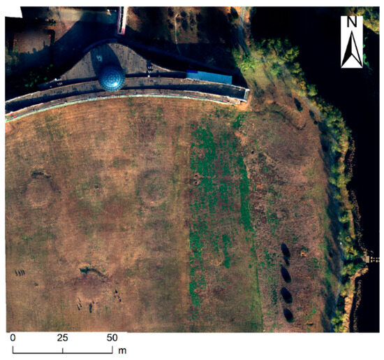 Eventually, the drone-based multispectral remote sensing images were converted into land surface reflectance data using Equation (8). Moreover, the individual images above were mosaiced together into a complete reflectance image covering the entire test region after performing photogrammetric orthorectification, and the mosaiced result is shown in Figure 9.