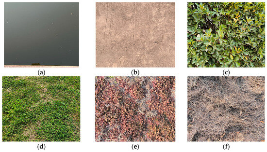 Samples of six typical land cover types. (a) Lake water; (b) slab stone; (c) shrub; (d) green grass; (e) red grass; (f) dry grass.