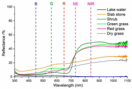 To validate the accuracy of the calculated reflectance results, some sample regions with a relatively large area and uniform spectrum were selected. Six typical land cover types (as shown in Figure 10), i.e., lake water, slab stone, shrub, green grass, red grass, and dry grass, were included, and their respective spectrum results were measured in situ by using the PSR-1100 hyper-spectrometer, synchronized with aerial photogrammetry, and the results are shown in Figure 11. Then, the land surface reflectance results calculated from the multispectral images were compared with the results measured in situ by using the PSR-1100 hyper-spectrometer (as shown in Table 3). It should be noted that lake water contains some impurity substances, and all other land covers are not absolute uniform reflectors either. Our approach involves measuring several samples for each land cover type and calculating the mean values.