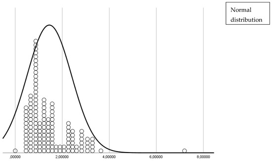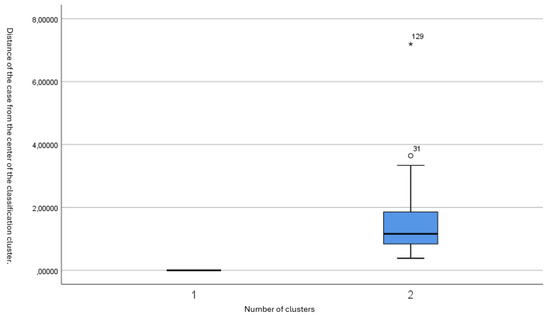 The distribution of subjects within each cluster is depicted in Figure 1 and Figure 2. Figure 1 shows the distances of each subject from the cluster center, highlighting that the majority were tightly grouped around the center of Cluster 2. Figure 2 presents a box plot illustrating the low variability within Cluster 2 and the distinct separation of the outlier in Cluster 1.