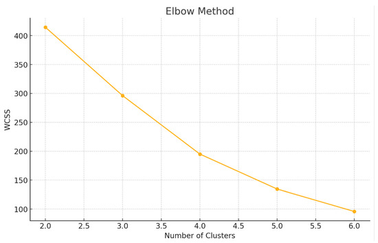 The Elbow Method was used to evaluate the relationship between the number of clusters (k) and the Within-Cluster Sum of Squares (WCSS), which quantifies the compactness of each cluster. For each value of k (ranging from 2 to 6), we computed the total WCSS, representing the sum of squared distances between each data point and its respective cluster centroid. These values were plotted against increasing numbers of clusters. The “elbow point” of the curve—where the rate of WCSS reduction markedly slows—was interpreted as the optimal number of clusters, representing a trade-off between model complexity and explanatory power.