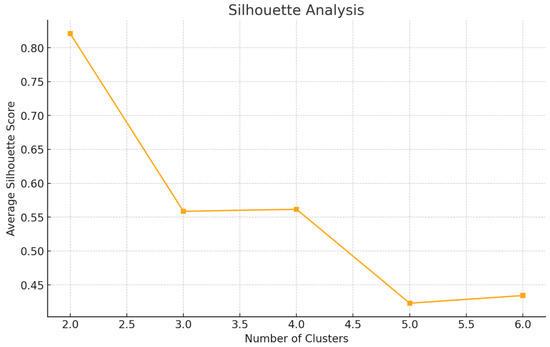 To determine the optimal number of clusters, both the Elbow Method and Silhouette Analysis were applied to the four principal components derived from PCA. The Elbow plot (Figure 3) showed a distinct change in slope between k = 2 and k = 3, indicating a point of diminishing returns beyond two or three clusters. This “elbow’ suggests that adding more clusters beyond this point does not significantly reduce the Within-Cluster Sum of Squares (WCSS), supporting a more parsimonious model.