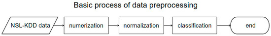 The NSL-KDD dataset is an improved version of the KDD CUP 99 dataset. Compared to the original KDD dataset, the NSL-KDD dataset removes redundant records from the training set and does not contain duplicate records in the test set. Therefore, normalization is directly applied here. The min–max normalization method is used for data transformation, mapping the result values to the range [0, 1]. The transformation function is given by Equation (1):