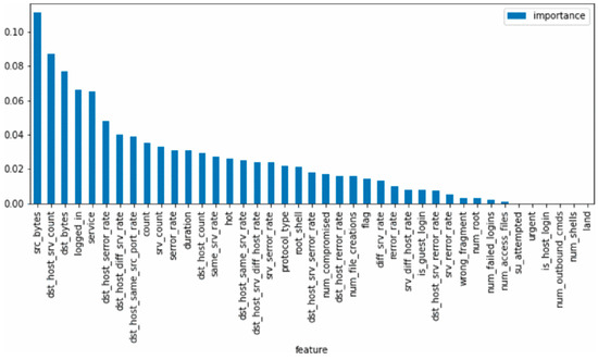 This section investigates a malicious traffic detection method based on multi-model fusion, aiming to improve the model’s ability to recognize malicious traffic patterns in complex network environments and addressing the limitations of a single model in generalization and accuracy. To achieve this, a detection framework was designed using the stacking ensemble strategy, which integrates the predictions of multiple base learners to enhance the recognition precision of malicious traffic patterns. To further optimize feature expression, we performed feature selection on the NSL-KDD dataset and used the random forest (RF) algorithm to identify key features.
