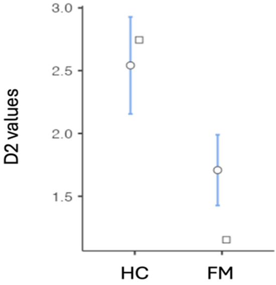 Differences in correlation dimension (D2) between healthy controls and fibromyalgia patients. Acronyms: D2 = correlation dimension of Heart Rate Variability; FM = Fibromyalgia group; HC = Healthy control group. The round-shaped symbol indicates the mean (confidence interval = 95%). The square-shaped symbol indicates the median.