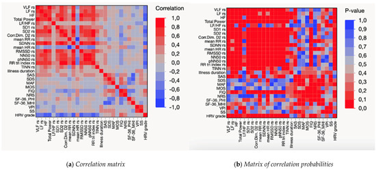 Matrices of correlations (a) and correlation probabilities (b) between indices of heart rate variability and clinical variables in FM patients. Notes: control for age; main acronyms are listed in the abbreviation section, whereas the full, detailed table (Table S1 is attached as Supplementary Materials. As data did not distribute normally, Spearman’s pairwise correlation was used for the analyses (Table S1), whereas Pearson was used for further testing in addition to non-parametric statistics (Figure 2).