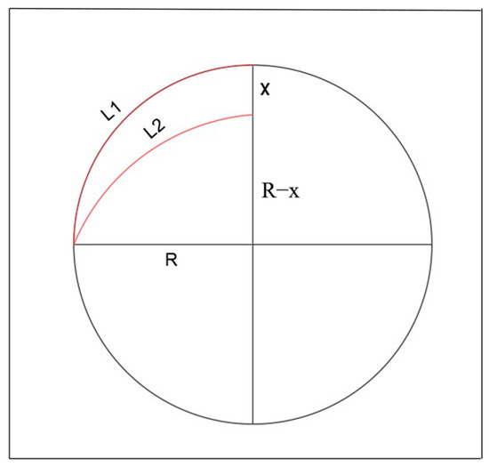 At the initial calibration length of the fiber optic loop, the corresponding initial calibration length is associated with the initial bending loss, denoted as and , respectively. When the size of the fiber optic loop decreases, its circumference is also continuously reduced. The deformation of the circular ring can be obtained through coordinated deformation; hence, the displacement of coordinated contraction and the change in bending loss is as follows: