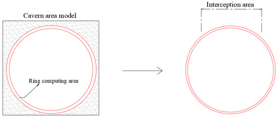 Utilizing TrueGrid (Mesh Generation Preprocessing Software), a specimen model was established based on the circular opening model, with dimensions determined to ensure a sufficiently large radius for the fiber optic sensor to respond to bending. The designed small-scale experimental model, as shown in Figure 7, consisted of a cubical block with an opening, measuring 0.3 m × 0.3 m × 0.15 m, and a chamber diameter of 0.2 m. The mesh in the areas of particular structural interest was appropriately adjusted. After conducting a mesh sensitivity analysis and verification through computational assessment, a mesh size of 10 mm was selected. The model comprised approximately 40,000 elements.