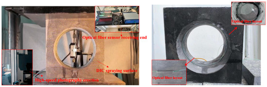 Displacement sensors were installed to measure the displacement of key points. In this study, the top point of the cavern was selected as the key point. Subsequently, optical fiber sensors were installed along the central circumference of the cavern. The sensors were bonded with a special adhesive to ensure coordinated deformation between the structure and the fibers. At the end of the fiber extending from the cavern, a fiber optic signal matching paste was used as the termination point. The transmitting end was then inserted into the demodulator to complete the calibration of the fiber optic sensors. The overall layout is shown in Figure 4.