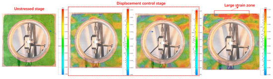 In the experiment, we applied densely scattered pattern stickers on the surface of the specimen for quasi-static testing and used Digital Image Correlation (DIC) technology to monitor the strain field changes on the specimen’s surface, comparing them with numerical simulation results for validation. Prior to the experiment, the position and focus of the industrial camera were adjusted to ensure that image quality met the required precision standards. DIC technology enabled us to observe the gradual increase in strain under displacement control, facilitating the visualization of critical areas for analysis. The strain field changes are depicted in Figure 5.