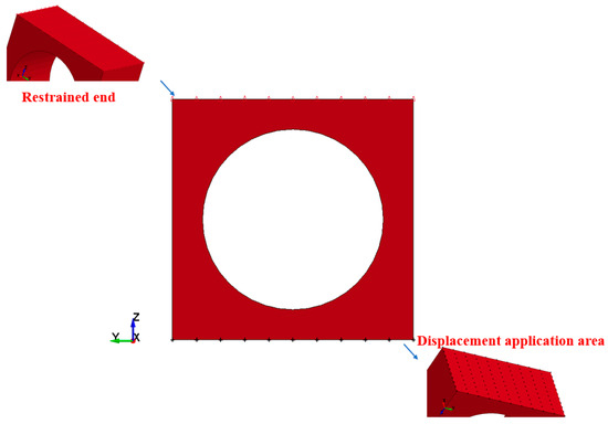 After analyzing the test environment, the boundary conditions were determined for the simulation loading. The displacement was applied using the BOUNDARY_PRESCRIBED_MOTION keyword, which defines a prescribed motion (displacement, velocity, or acceleration) for nodes or node sets. The BOUNDARY_SPC keyword was used to apply constraints to the selected node surfaces. Friction was applied to the upper and lower surfaces to match the displacement and constraint modes of the test, ensuring strain transfer.