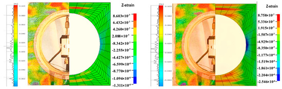 Therefore, by expanding the experimental and numerical simulation parameters, a significant linear relationship between displacement and hoop strain was obtained. The deformation field of the specimen was captured using DIC technology to correspondingly validate the numerical simulation, further obtaining the changes in displacement and hoop strain produced under different conditions. Consequently, hoop strain was utilized to predict and monitor the critical point displacement within the chamber, providing a more convenient method for studying the trend of displacement changes.