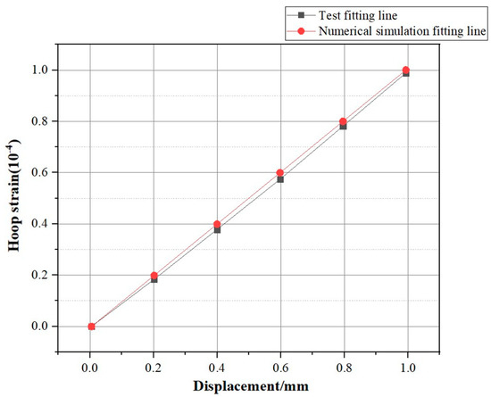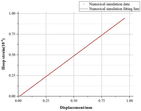 According to the strain results obtained after the test, the circumferential strain increased linearly with time. Subsequently, by analyzing the relationship between the key-point displacements within the region and the circumferential strain, a scatter plot could be obtained within the allowable error range. The linear fitting of this scatter plot yielded the graph shown in Figure 6.