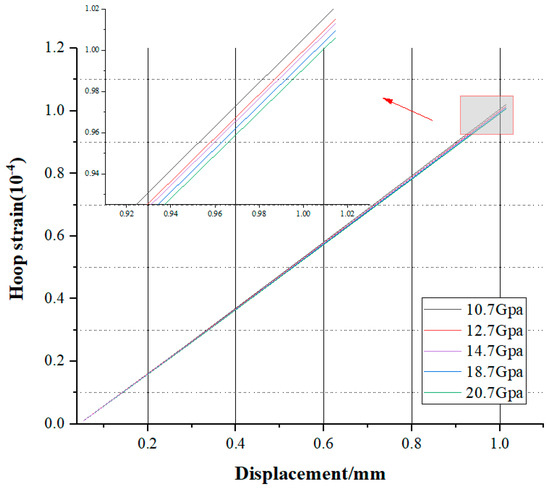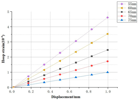 By altering the material parameters of the model to obtain the relationship between key-point displacement and circumferential strain under materials of different properties, and in conjunction with the numerical simulation analysis from Section 3, key parameters were changed, specifically the elastic shear modulus in this case. The study investigated whether the linear relationship obtained was universally applicable to different materials and structures during the elastic phase while also analyzing changes in the relationship coefficients under various conditions. To this end, multiple factors in Table 2 were designed for numerical simulation analysis to explore these variations.