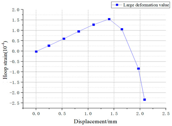 Under the model data representation, the top point was identified as a key point, and it was observed that the displacement at this location had a larger value compared to other circumferential points. By comparing the circumferential strain data with the experimentally measured data, it was found that the range of points with significant strain variation in the key area was relatively consistent. The Local Coord System was used to establish a cylindrical coordinate system to represent the circumferential strain and the displacement values of the key points, thus obtaining the relationship between the two. Since the structure and the applied forces were symmetric, half of the structure’s circumferential strain and key points were taken for the relationship analysis. The simulated scatter plot and fitting curve of the key-point displacement versus circumferential strain were obtained, as shown in Figure 10.