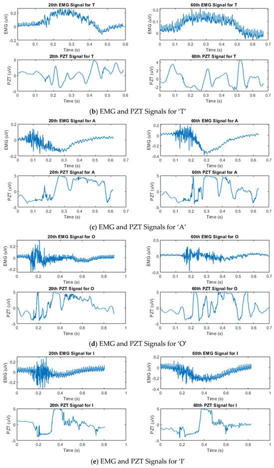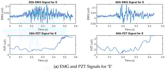 Example of synchronized EMG and PZT signals acquired during the 20th and 60th silent speech trials for each letter, illustrating their time and amplitude characteristics.