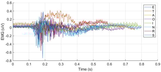 To evaluate the performance of the wireless wearable mouth movement monitoring system and ML approach proposed in this study, we recorded sensor signals corresponding to eight letters, listed in Table 2, which represent the most frequently used letters in the English language [19]. Each letter was pronounced without sound while sensor data were collected in real time. A total of 100 trials were conducted for each letter, yielding 100 sets of sensor data per letter. To minimize motion artifacts, data were collected under static conditions, excluding any physical movement. Ensuring proper electrode–skin contact is critical for optimal data acquisition. Maintaining stable electrode placement throughout the recording period is essential, as secure contact guarantees the highest quality signal recordings.