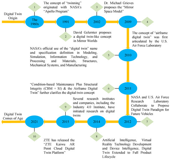 The concept of digital twin can be traced back to 2002, when Professor Grieves of the University of Michigan first proposed the concept of “Mirrored Space Model” (Mirrored Space Model) in his Product Lifecycle Management (PLM) course, which laid the foundation for the birth of digital twin [7]. The concept of Mirrored Space Model was first introduced by Prof. Grieves in his Product Lifecycle Management (PLM) course, which laid the foundation for the birth of digital twins. Subsequently, Prof. Grieves further elaborated on the digital twin in his 2011 book and defined it as a virtual information structure used to describe products from the micro-atomic level to the macro-geometric level [8]. Thereafter, the National Aeronautics and Space Administration (NASA) formally defined digital twins as a multi-physics field, consisting in multi-scale, probabilistic, ultra-fidelity simulation in 2012, fully utilizing a physical model, sensor data and historical operational data to reflect the state of corresponding physical entities in real time [9]. Prof. Tao Fei of Beijing University of Aeronautics and Astronautics previously conducted deep theoretical research and explored application practices for digital twins, mainly including digital twin workshops, digital twin-based design and manufacturing, and a five-dimensional digital twin model [10]. Figure 1 shows the five-dimensional model of digital twins proposed by Prof. Tao Fei, and Figure 2 shows the development history of digital twin technology.