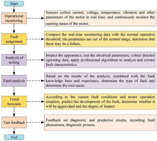 As an important piece of equipment for electromechanical conversion, motors play a key role in industrial production, transportation, daily life and many other fields. However, due to the complex working environment, long-term operation and other factors, motors are prone to various failures. Accurately identifying the types of motor faults, deeply exploring the causes of faults and applying effective diagnostic methods to find and solve problems in a timely manner have become core tasks to ensure the reliable operation of motors. Figure 4 gives the traditional motor fault diagnosis process.