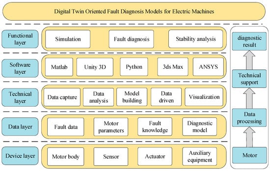Motor fault diagnosis technology is constantly developing, gradually evolving from traditional sensor-based monitoring and simple data analysis to the use of data mining, machine learning and other advanced technologies, achieving promising results in motor fault diagnosis in various fields. In practical applications, the existing diagnostic techniques still face many challenges, while traditional methods often have difficulty comprehensively accessing operating state information of motors in real time, resulting in insufficient diagnostic accuracy for some complex faults and early faults. With the acceleration of industrial intelligence processes, motor systems will become more and more complex, resulting in higher requirements concerning the accuracy, timeliness and intelligence of fault diagnosis. Against this background, digital twin technology stands out with its unique advantages and opens up a new path for motor fault diagnosis. Figure 5 shows the architecture diagram of digital twin-based motor fault diagnosis.