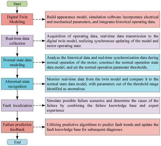 Digital twin technology, as an emerging digitalization tool, has brought a new light to the field of motor troubleshooting. Digital twins play a key role in system safety and risk assessment, which are closely related to worker safety and security. When heavy machinery fails, the consequences are unimaginable. In the field of electrical machinery, electrical and mechanical failures can lead to abnormal operation of the equipment, which not only interrupts production and causes material losses, but also jeopardizes the lives of workers. Digital twin technology can build a virtual model to map the operating status of equipment in real time. With the help of multi-source data acquisition and analysis technology, it digs deep into the equipment operation data, finding potential faults and warnings in real-time, so that workers can take precautions in advance to avoid safety accidents [77]. Figure 6 shows the flow chart of motor fault diagnosis based on digital twins.
