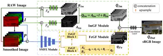 Workflow of GFNet. First, the low-light RAW image is packed to an N-channel tensor with a size of , and we also denote it as for convenience. Here, the number of input channels N is determined according to the pattern of the color filter array (CFA), e.g., for the Bayer pattern. The bilateral filtered result of is denoted as . Then, and are input to the SMFE module to jointly extract their multi-scale features. The extracted features are then passed to the ImGF and FeGF modules for subsequent processing. In the ImGF module, the extracted features, together with the input source images, are used to infer and for the guided fusion result in the image domain. In the FeGF module, the extracted multi-scale features are first fused by FeGF blocks in a GF-like way at each scale and then aggregated by upsample blocks to obtain the final feature , where C refers to the number of channels. Finally, and are concatenated and input to a small network with attention and convolutional layers (details are provided in Appendix A) to obtain the enhanced result with the sRGB format. The loss between and the ground truth is adopted for network training.