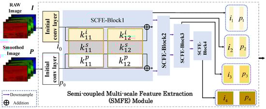 The detailed architecture of the SMFE module. and refer to the private convolutional kernel to extract features of and in the 1st SCFE block, and refers to the shared convolutional kernel. Please refer to [41] for details of the SCFE block.