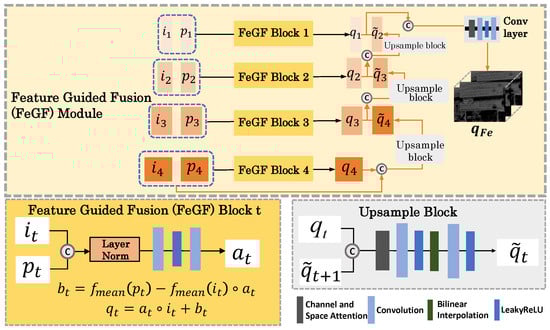 Here, refers to the concatenation operation with a channel and space attention layer, is a small convolutional network, and denotes the upsample block illustrated in Figure 3. In addition, we define as the supplement to upsample . Then, the final output of the whole FeGF module is .