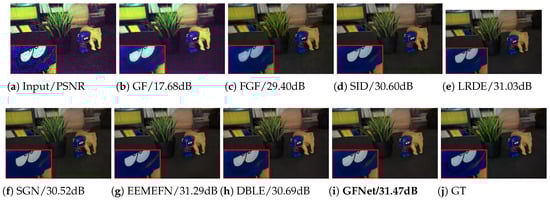 As for visual quality, the performance of our method is also promising. Specifically, as can be seen from Figure 4, most of the compared methods, including GF, FGF, SID, and DBLE, suffer from unexpected artifacts and uneven surfaces. While LRDE, SGN, and EEMEFN have smoother visuals, they are noticeably over-smoothed and lose important details. In comparison, our method provides a more faithful recovery with reference to the ground truth.