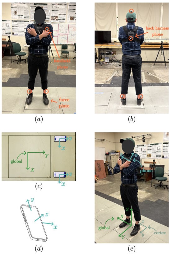 (a,b) Experimental setup showing phone locations, markers (circled), and force plate. (c) Initial phone placement aligned with desired global axis system. (d) Phone’s local coordinate system. (e) Example global coordinate system (XYZ) and device local coordinate systems (xyz).