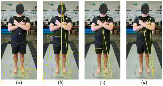 Steps for the determination of COM location. (a) Projection of ankle pivot onto force plate. (b,c) Determination of COM location. (d) COM position relative to handheld smartphone.