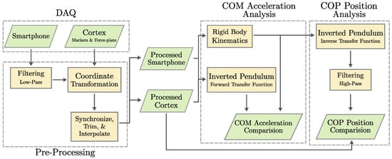 To summarize the approach: data are acquired and put through pre-processing to ensure compatibility and reduce noise. For the first analysis pathway, smartphone data and marker positions are used in the rigid body kinematics computation to determine the COM acceleration. Applying FFT to the force plate’s COP position data converts the signal to the frequency domain where the inverted pendulum transfer function is applied to form the COM position in the frequency domain, and an inverse FFT generates the COM position in the time domain where finally a finite difference method is applied twice. This facilitates the comparison of COM acceleration results from the smartphones and force plate.