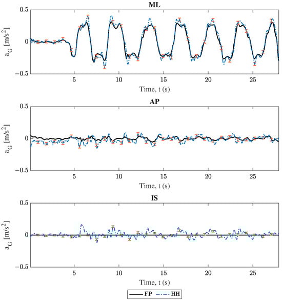 Trial 2 center of mass acceleration () comparison. Force plate (FP) versus handheld smartphone (HH), where ML, AP, and IS represent the medio–lateral, antero–posterior, and inferior–superior axes respectively. The error bars represent confidence intervals.