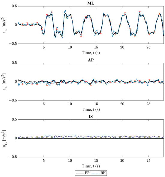 Trial 2 center of mass acceleration () comparison. Force plate (FP) versus back harness (BH) smartphone, where ML, AP, and IS represent the medio–lateral, antero–posterior, and inferior–superior axes respectively. The error bars represent confidence intervals.