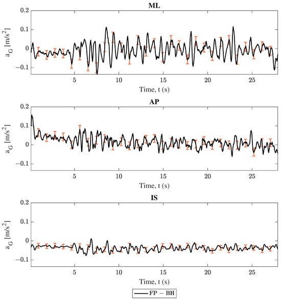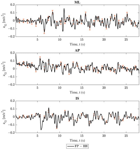 As described in Section 2, COM acceleration estimations were compared between each phone and the force plate. Projections from both smartphones followed Equation (1), and force plate data followed Equation (5). The comparison between these results for trial 2 (swaying in the medio–lateral direction) are shown in Figure 4, Figure 5, Figure 6 and Figure 7. Force plate (FP) results are compared to the handheld (HH) and back harness (BH) smartphones in Figure 4 and Figure 5, respectively. The differences of results plotted in Figure 4 and Figure 5 are shown in Figure 6 and Figure 7, respectively. All smartphone curves include confidence intervals computed following Section 2.6.